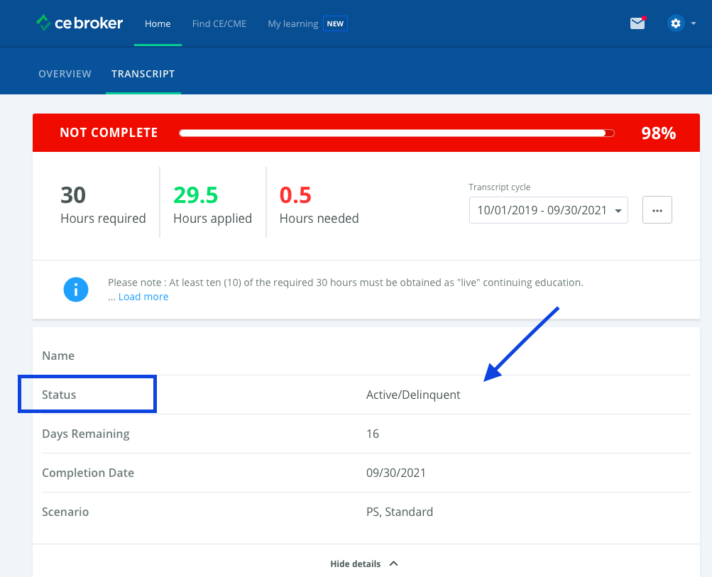 1.) Complete and report any missing CE. Log into your CE Broker account and ensure all CE required for your delinquent renewal cycle has been completed and reported to your CE Broker account.