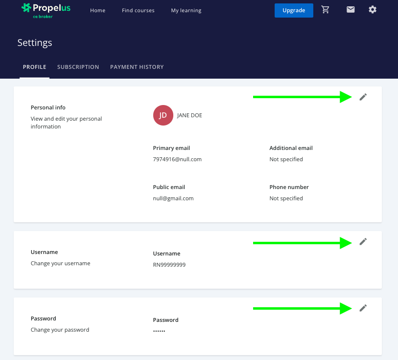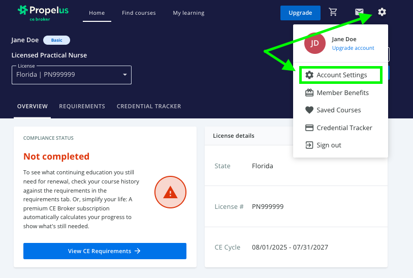 Note: Your name and the public email listed in your account reflect the information on file with your regulating entity. They cannot be updated from your CE Broker account. If you need to make changes, please update the information on file with your state.
