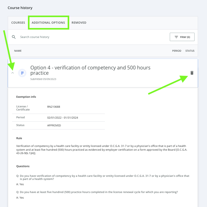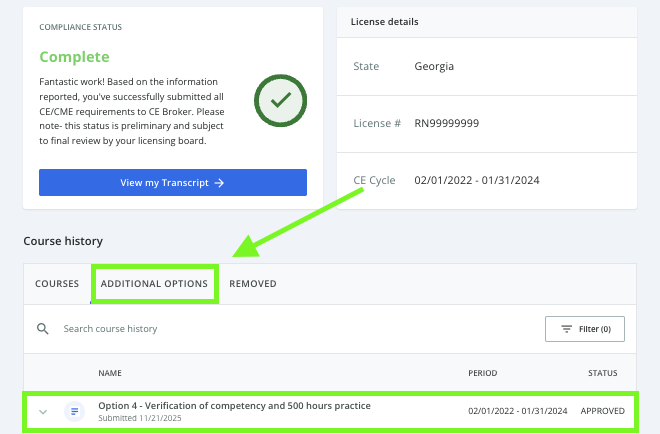 8. To check on the status of a reported exemption, view your CE Broker Course History.