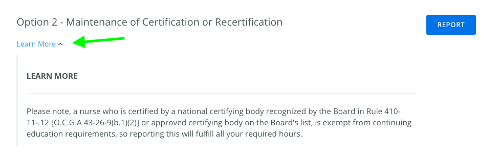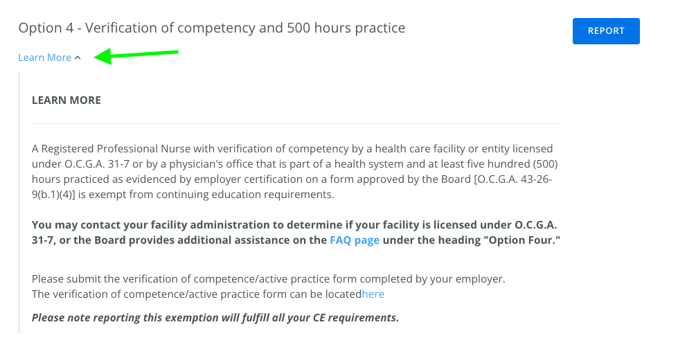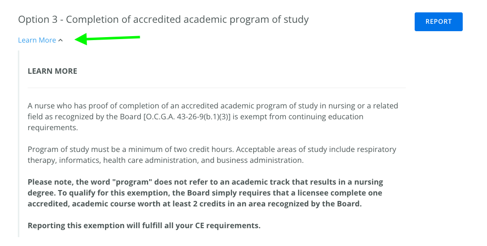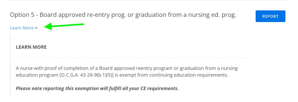 The Georgia Board of Nursing allows licensees to report CE Exemptions to satisfy or eliminate the need to complete continuing education credits for their renewal. You can upload an exemption to fulfill all your CE requirements.