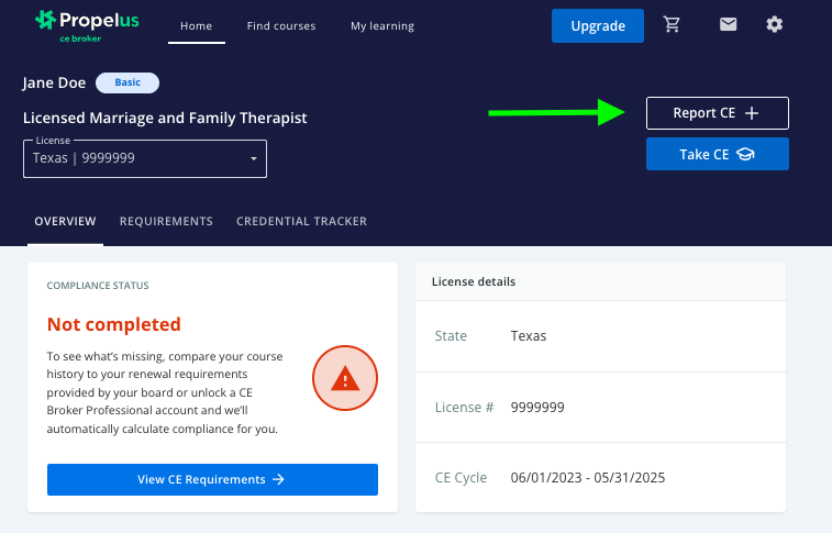 Click on the Report CE button located at the top of your dashboard.