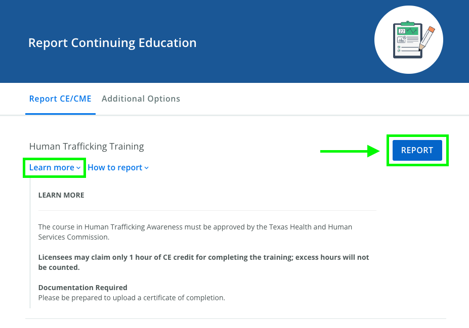Select the Human Trafficking requirement from the list of reporting options. You can click the "Learn more" section to review details and regulations.