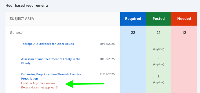 Many boards place a "cap" or limit on Anytime hours. For example, if your Board allows a maximum of 12 Anytime hours and you complete 15, the remaining 3 hours will appear in your transcript but will not count toward your total required hours for renewal. You will see a message that says "Limit on Anytime courses":