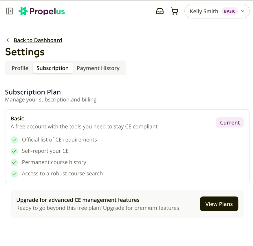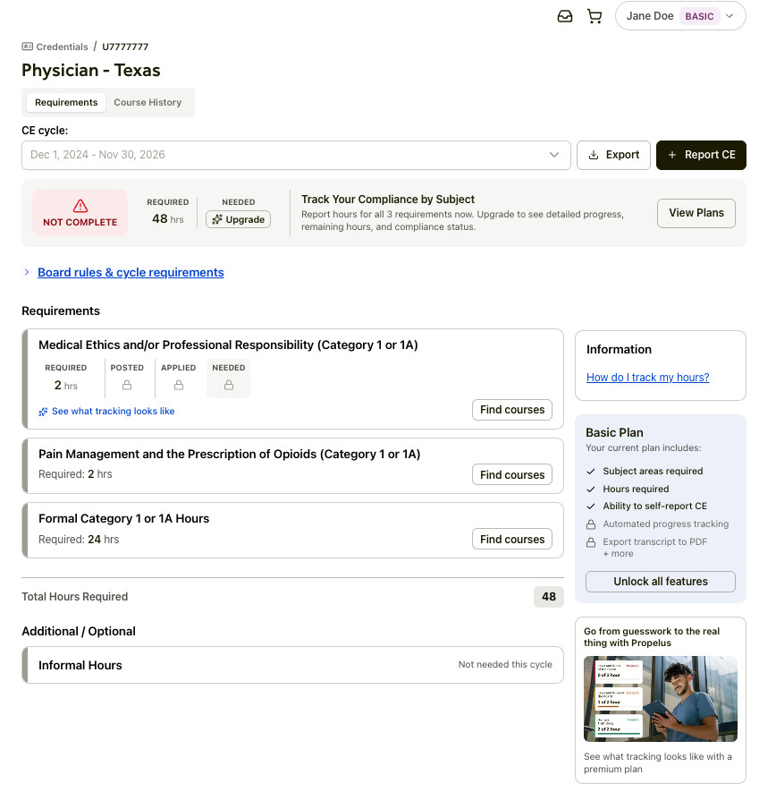 The requirements view offers a transparent look at exactly what CE is necessary for your specific license renewal. To make compliance even simpler, we have integrated a direct link to the Course Search that is automatically filtered to match your state and profession.