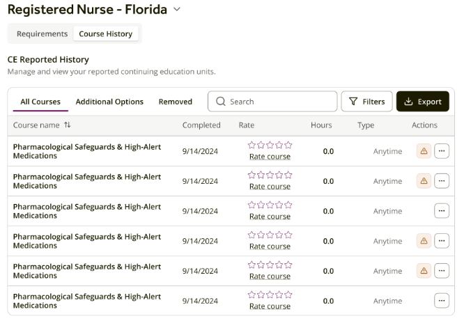 The Course History is now a searchable repository where you can manage reported records and filter detailed course data. If you need to report your progress outside of the platform, our seamless export features allow you to download documents quickly.