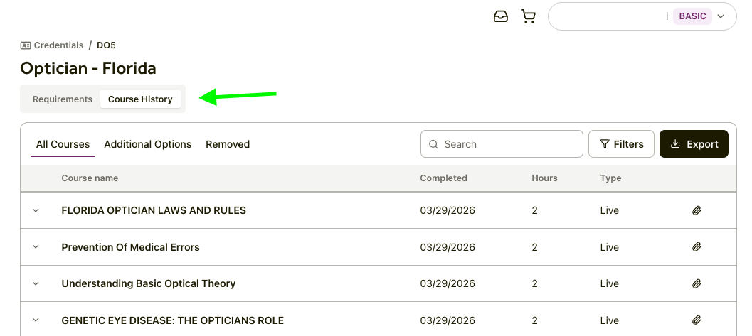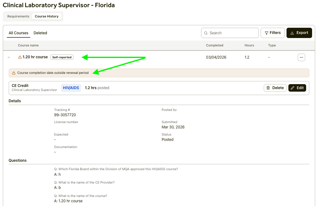 Your Course History will immediately notify you if a course is not counting toward your continuing education requirements. If there is an issue, an alert message will appear to help explain why the credits are not being applied.