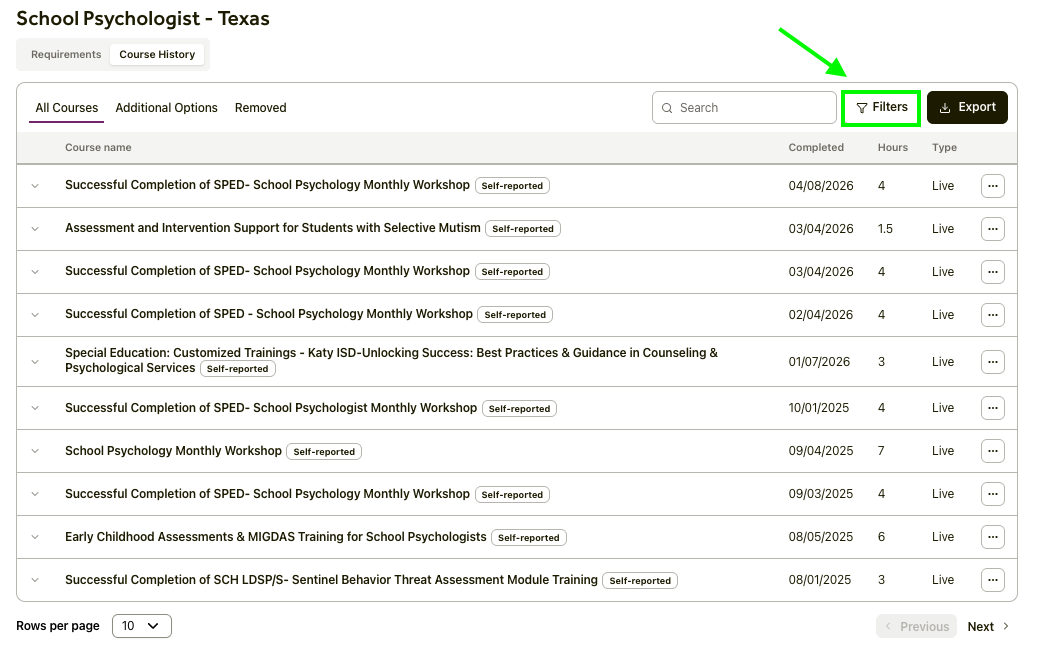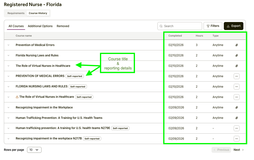 At a glance, the Course History section displays key details about each completed course, including the course name, the date of completion, delivery method (live vs anytime), reporting details such as self-reported item or reported by an educational provider, and the number of hours earned.