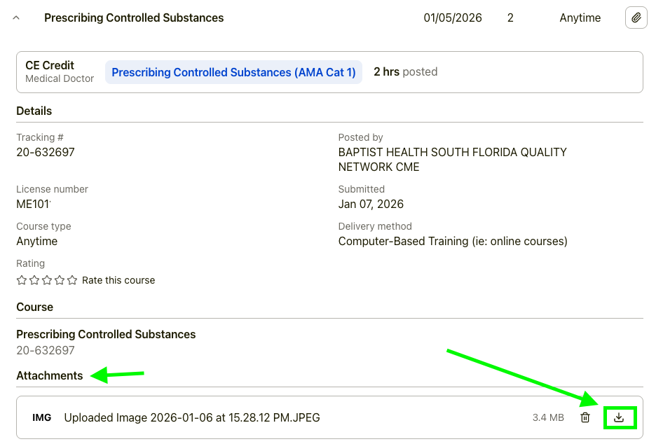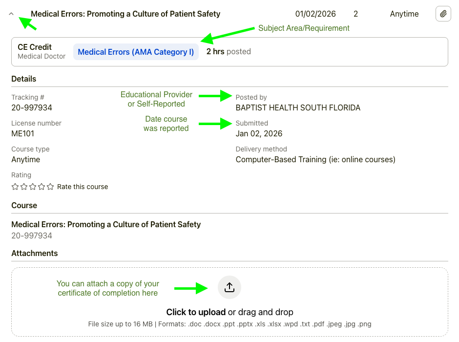 Clicking on a course will display additional details about the entry, including the profession and subject area the hours were applied to, the submission date, the name of the education provider, the course delivery method, and any certificates or supporting documentation that were uploaded with the entry.