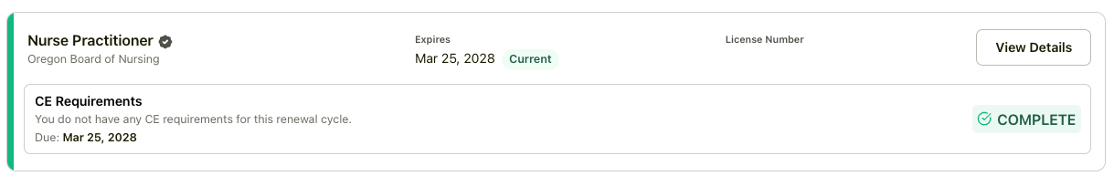 - Verify the CE Cycle date range to confirm the period for which the requirements apply.