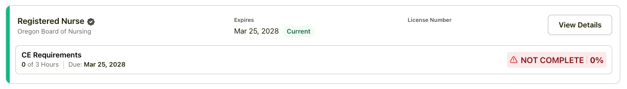If your compliance status says Not Complete, that means one of two things. Either the CE credit you have completed hasn’t been reported as required, or the CE credit required has not been completed.