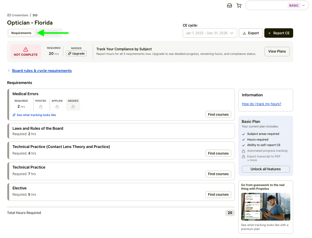 - Track your compliance manually. As a Basic user, you must use the Requirements tab as a checklist. Manually compare the courses you have completed and reported in your account against these requirements to determine your current progress toward compliance.