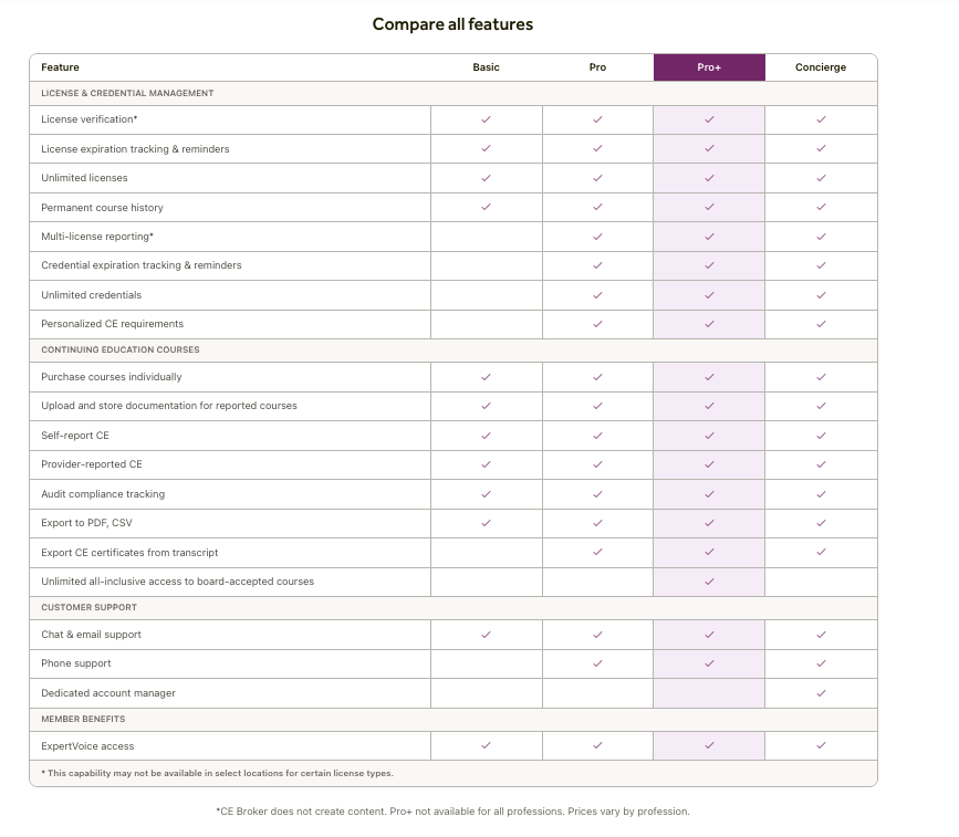 If you have a Basic account, and you would like for CE Broker to automate your compliance calculation, you can activate your Professional, Pro+, or Concierge Account benefits to unlock your CE Compliance Transcript. This powerful tool calculates the specific credits you need in order to complete your requirements.
