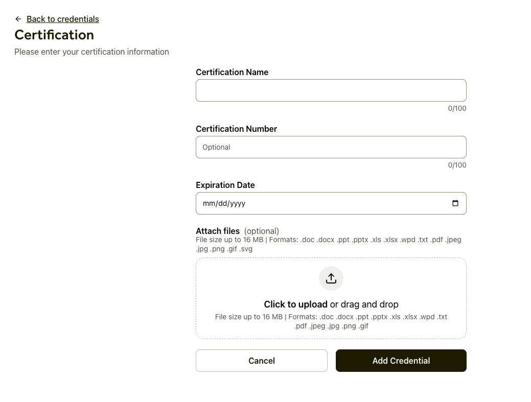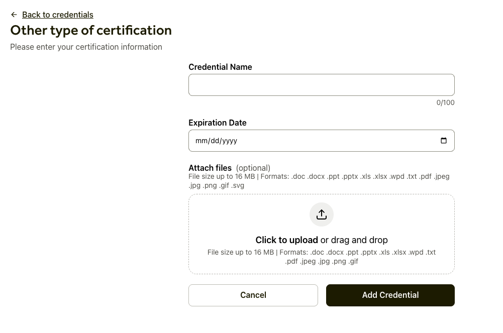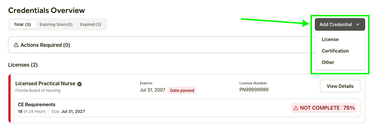2. On the Credentials Overview page, click Add Credential. There, you can choose to add a new license, certification or other.