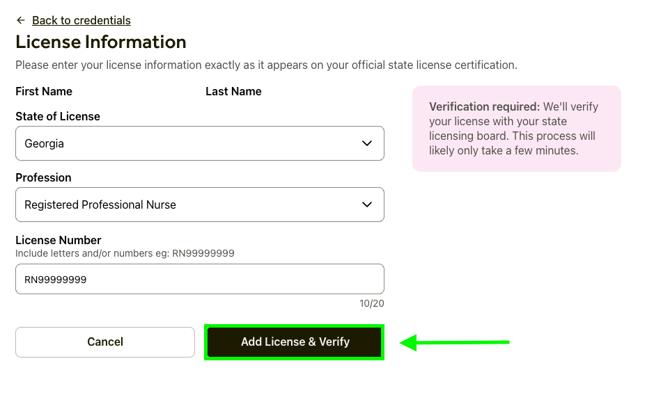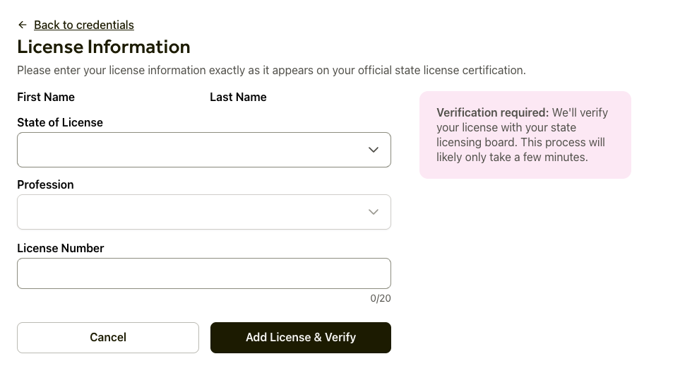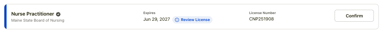 Pending: This means our system is currently communicating with the state board to verify your details. Please allow up to 24 hours for this process to complete. Once verified, you will be able to confirm the information and add it to your active overview.