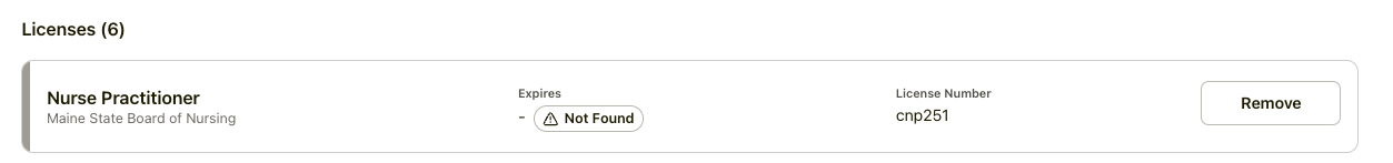 Not Found: If a license is marked as "Not Found," the information entered does not match the records provided by the state board. In this case, the only available option is to remove the entry. You may then attempt to add the license again, ensuring the license number and profession are exactly as they appear on your official state certificate.