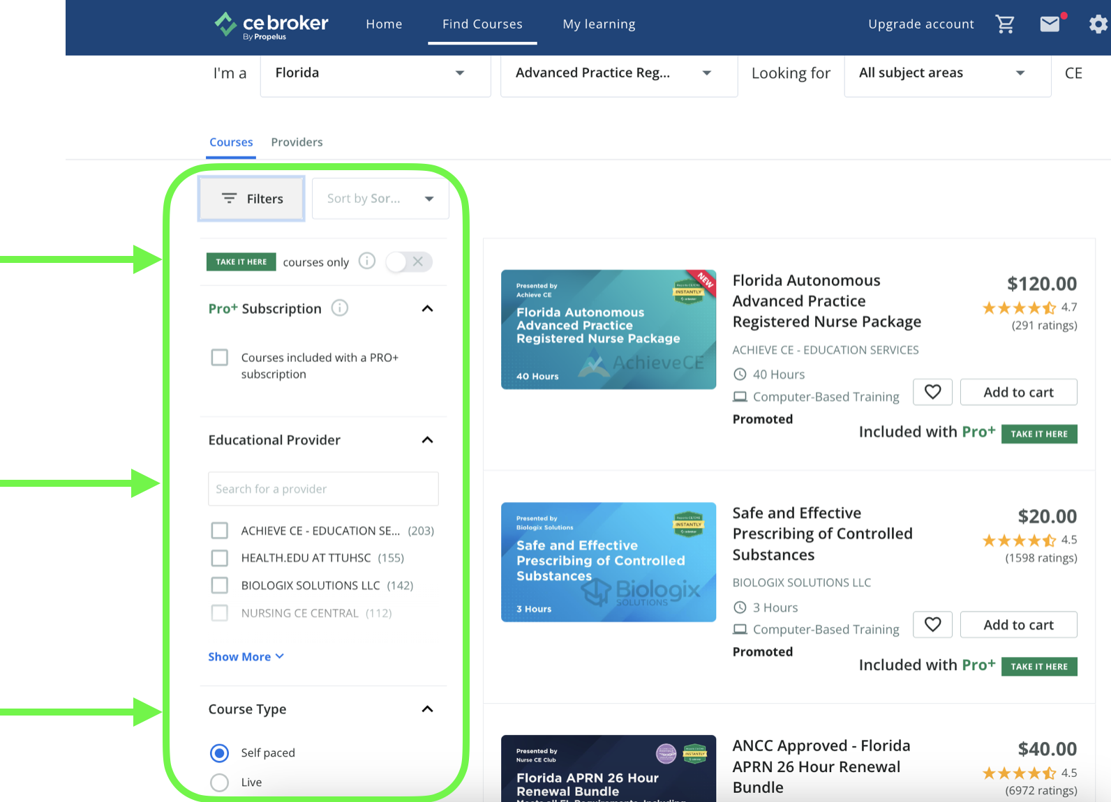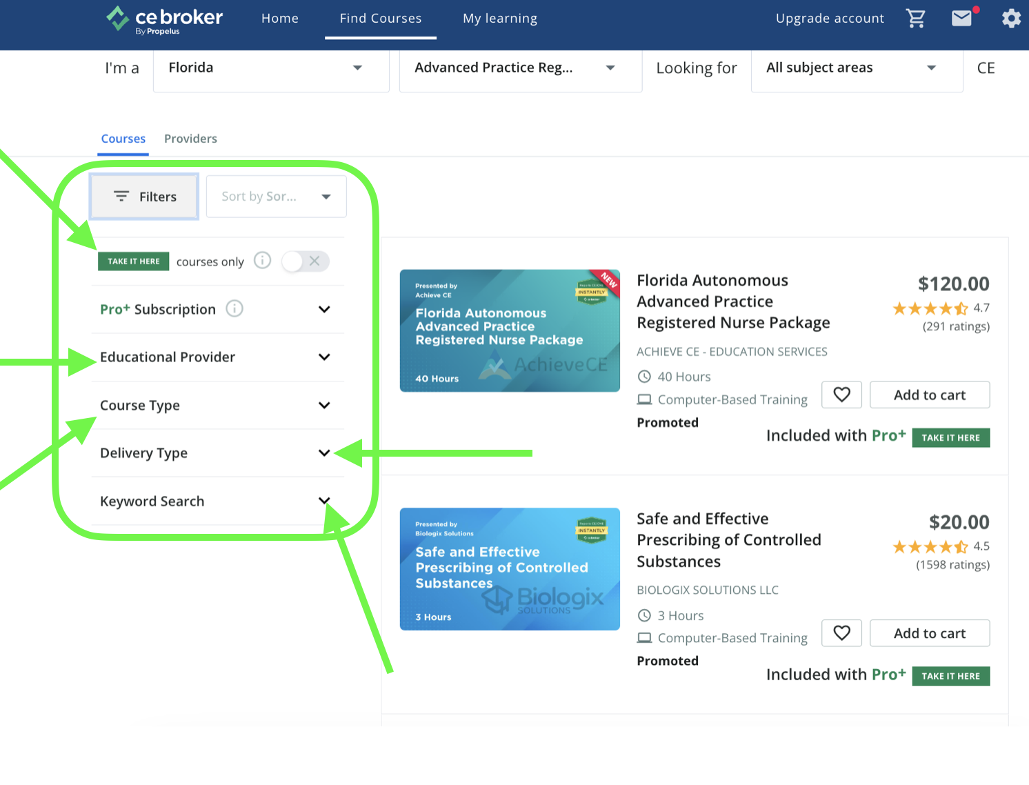 To view only the courses that can be taken directly through your CE Broker account, toggle on the Take it Here option.