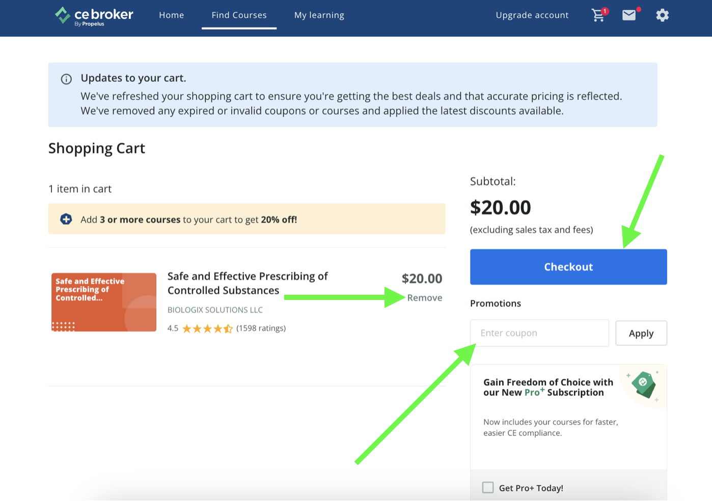 You can review your cart to remove courses or proceed with your purchase by selecting Checkout. If you have any promotional codes, be sure to enter them before completing your order.