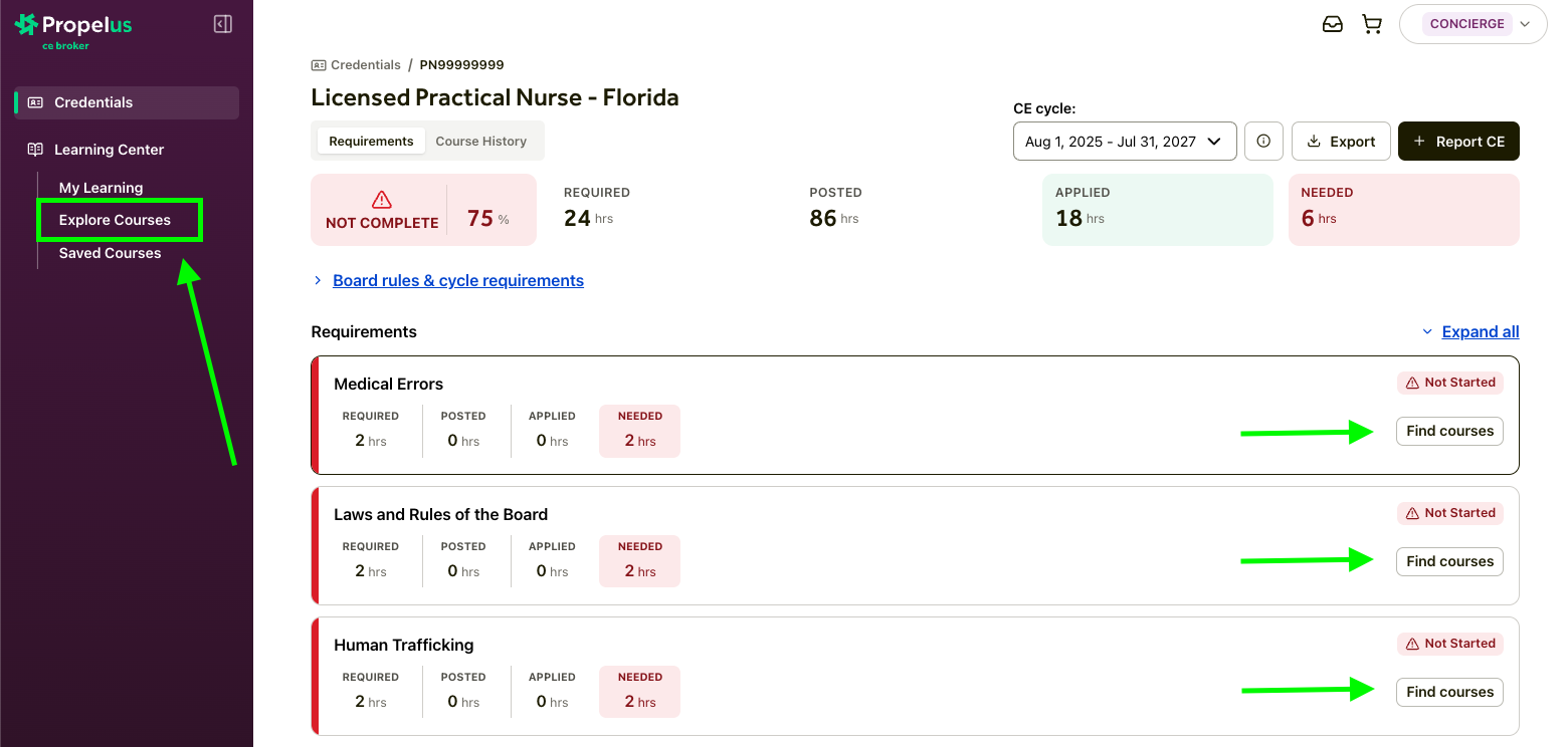 3. Click the Find Courses button next to each subject area to locate the desired coursework specific to your renewal requirements. You can also click the Explore courses in your CE Broker dashboard at the left side of the page: