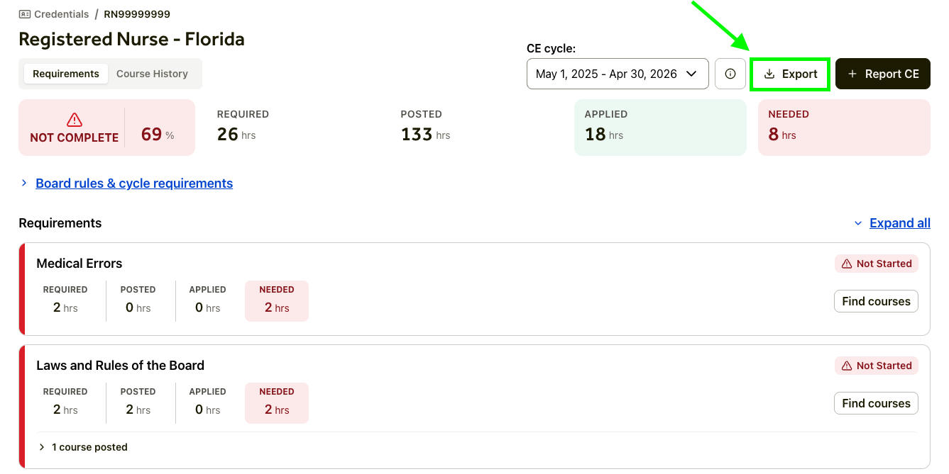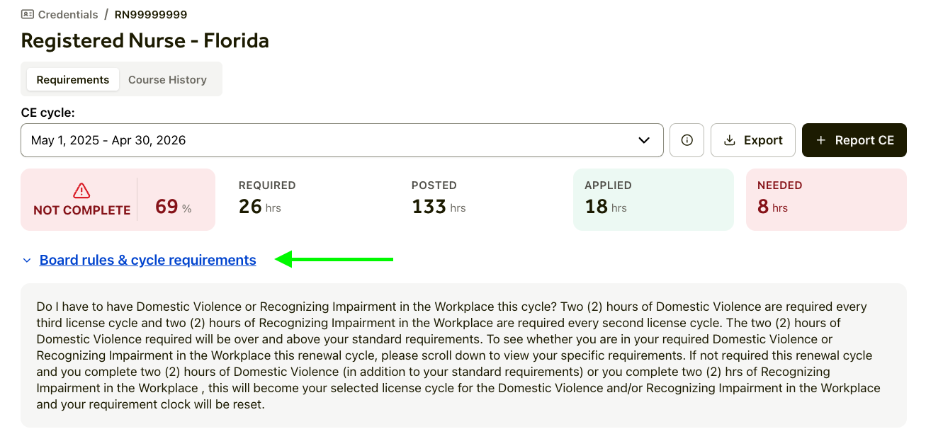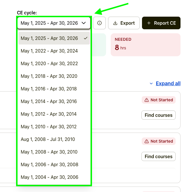 💡 Pro Tip: Click the date range under CE Cycle ▾ to access records from other renewal periods.