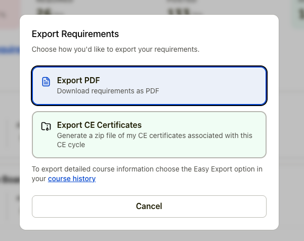 This allows you to export your transcript as a PDF or download CE certificates in a ZIP file.