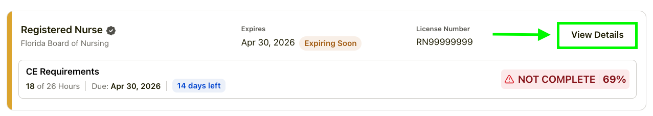 If your status shows Not Complete, click the View Details button to view your remaining requirements, including the number of hours and any specific subject areas you still need to complete.