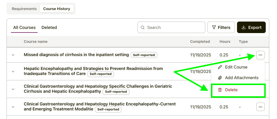 Please note: If you do not see the option to delete a course, it was reported by the education provider. In this case, you will need to contact our Support team for assistance.