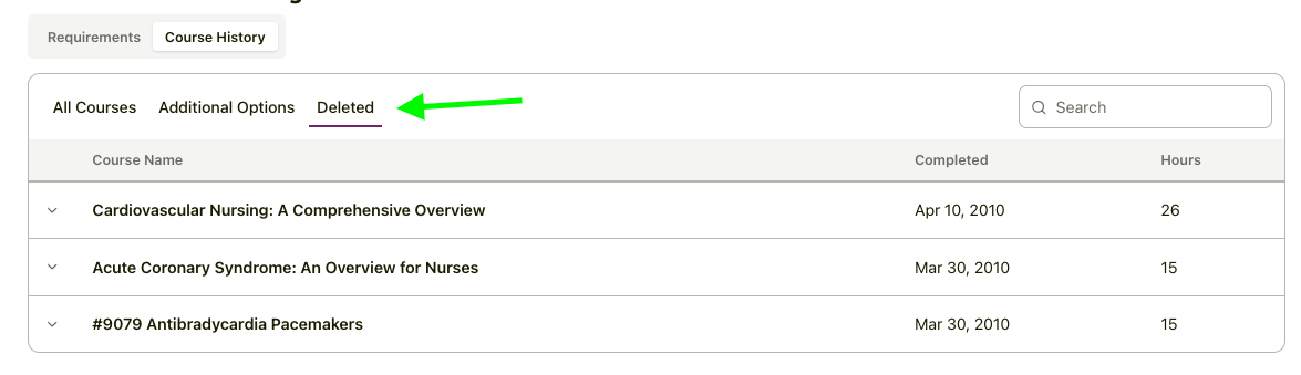 4. The course will be immediately removed and can be found later under the Deleted tab in your Course History.
