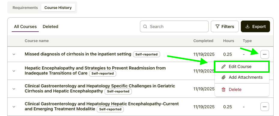 Locate the course. Self-reported CE can be identified by the tag and the three-dot menu next to the course entry. Click on the 3-dot menu and then select "Edit Course" from the dropdown options.