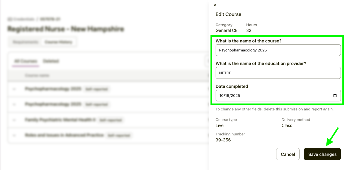 - Make Your Changes: A modal window will appear displaying your course details and you can now edit the Course Name, Provider Name, and Completion Date.
