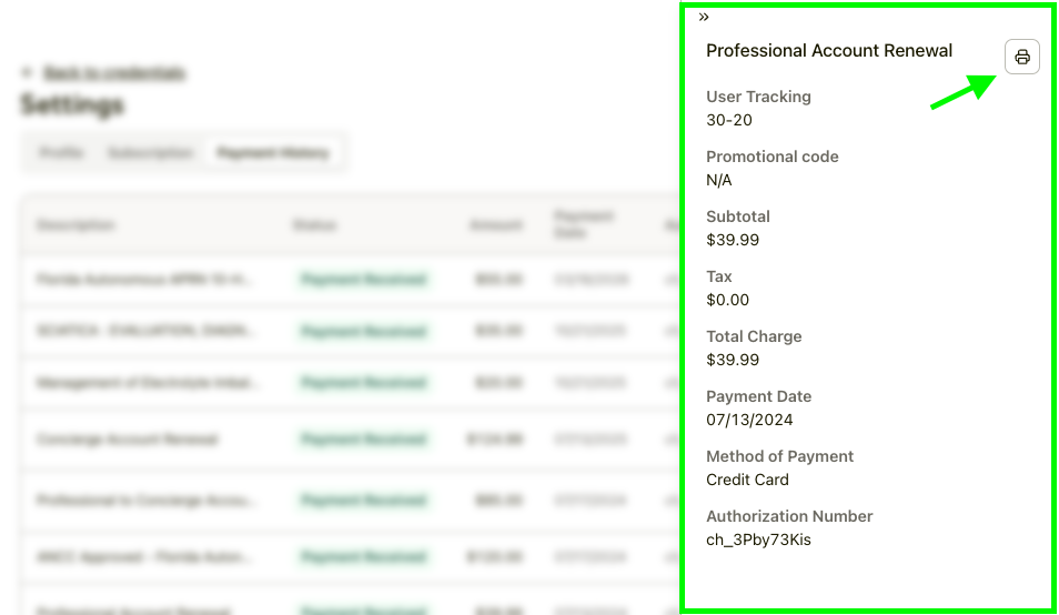 4. Once loaded, review the payments list and click anywhere on the line for the specific charge you need record of. Depending on your device settings, you can print the receipt or save it to your computer as a PDF by clicking on the Printer 🖨️ icon.